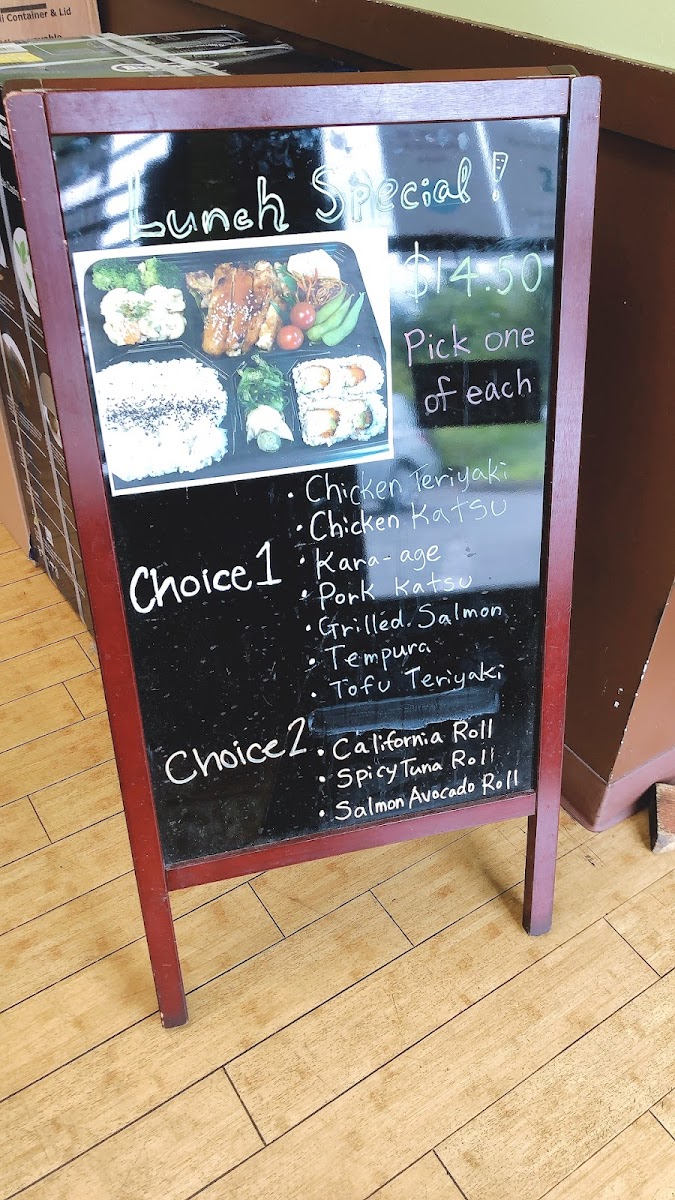 Chicken teriyaki, 1/2 California roll, salad, cooked veggie, edamame and tamago.